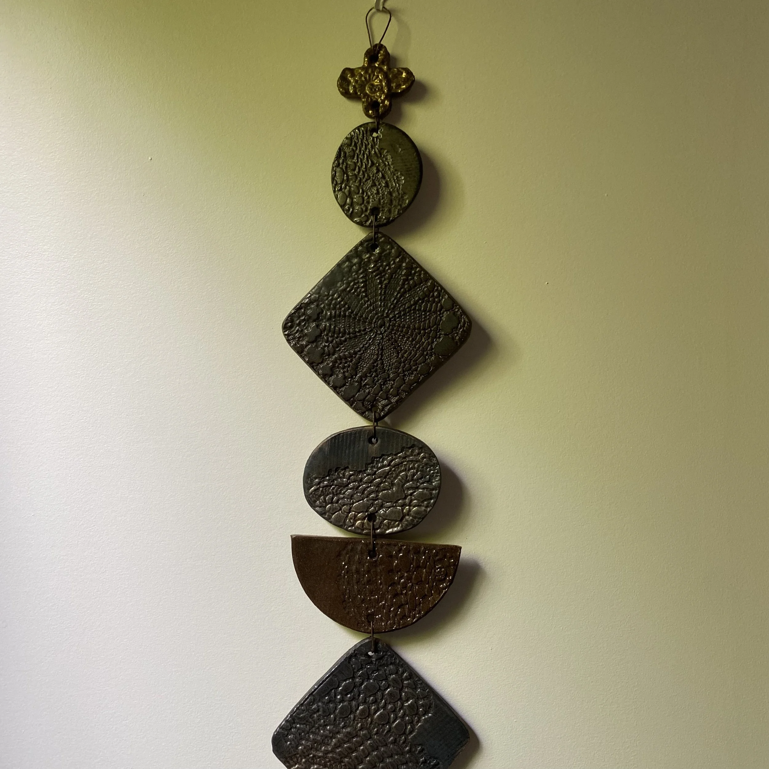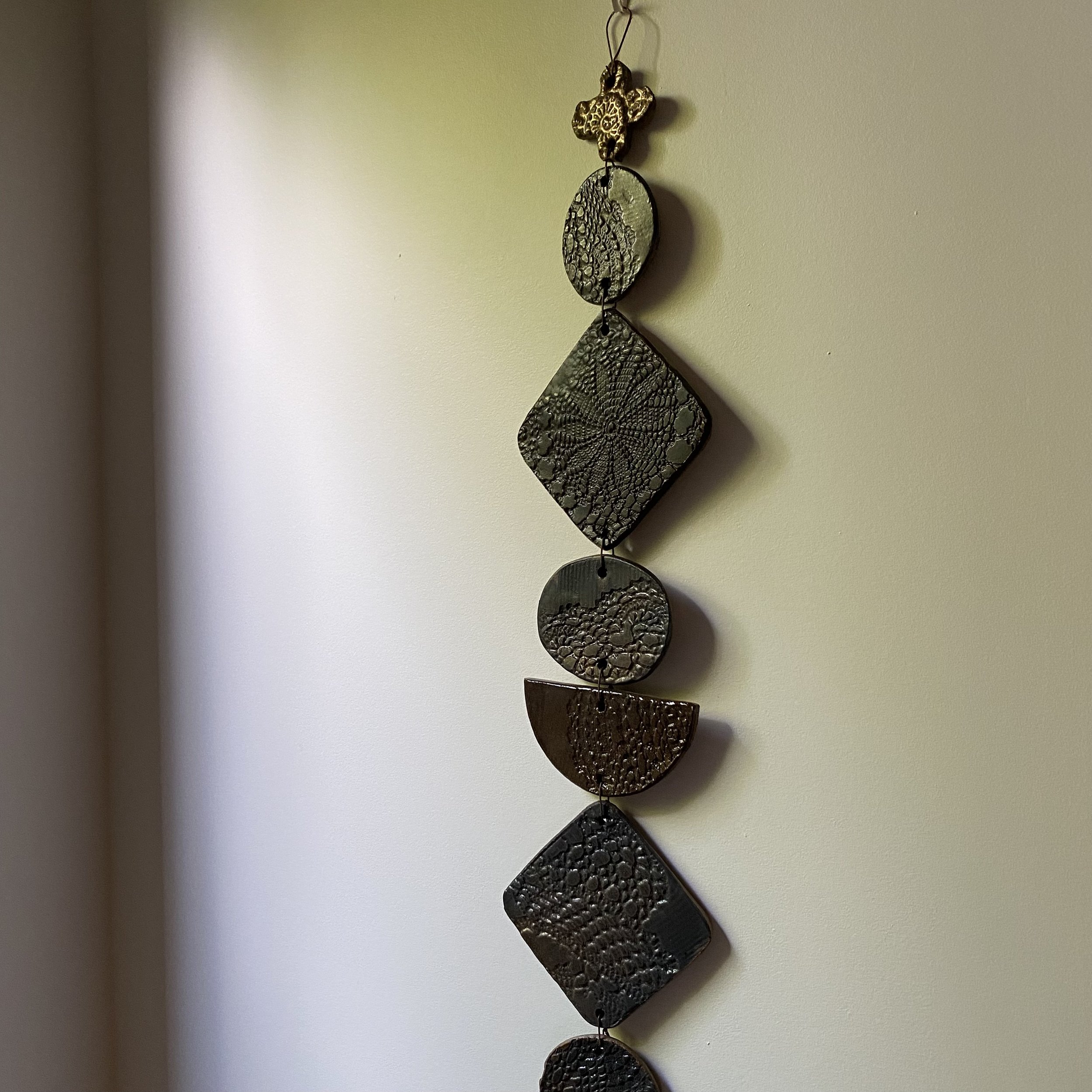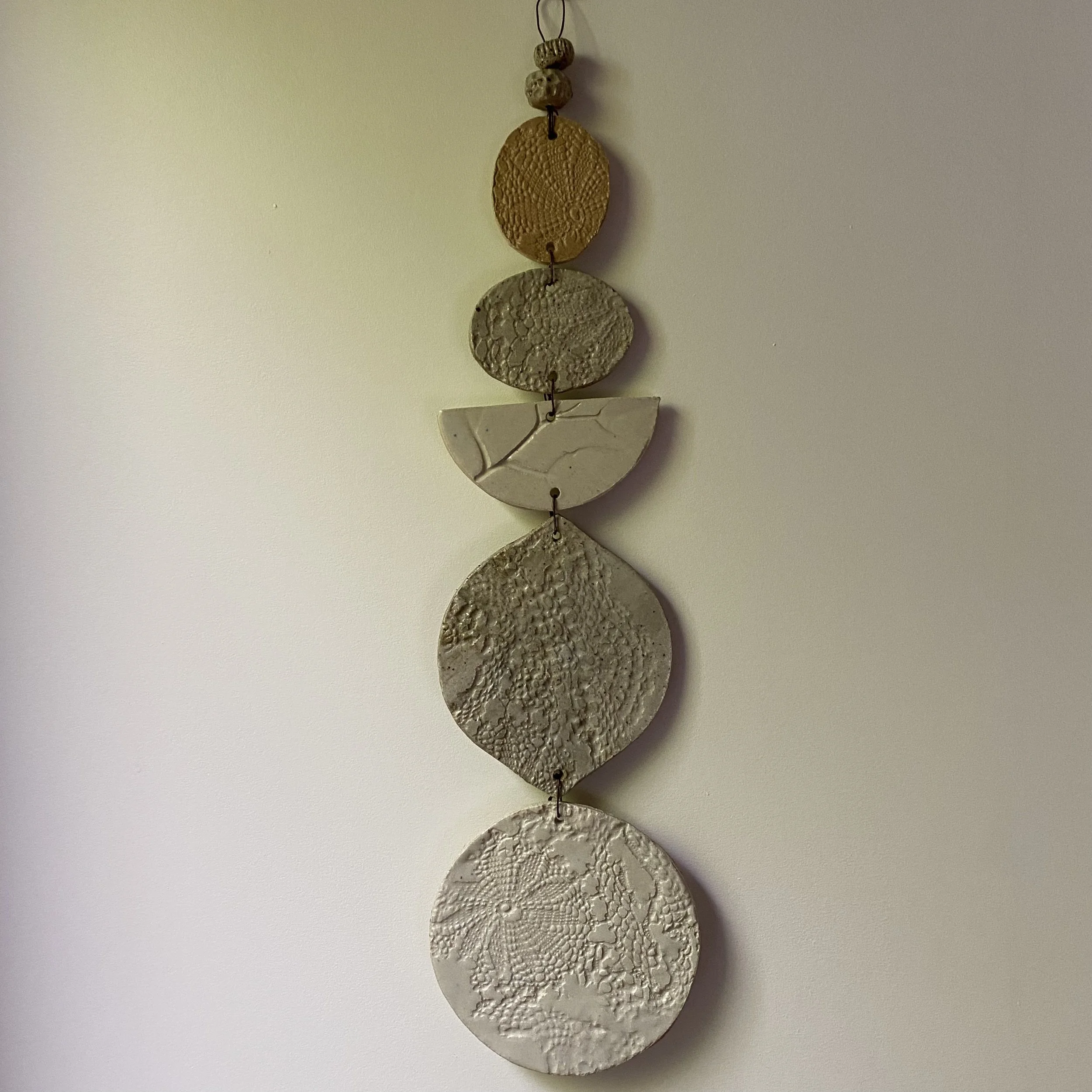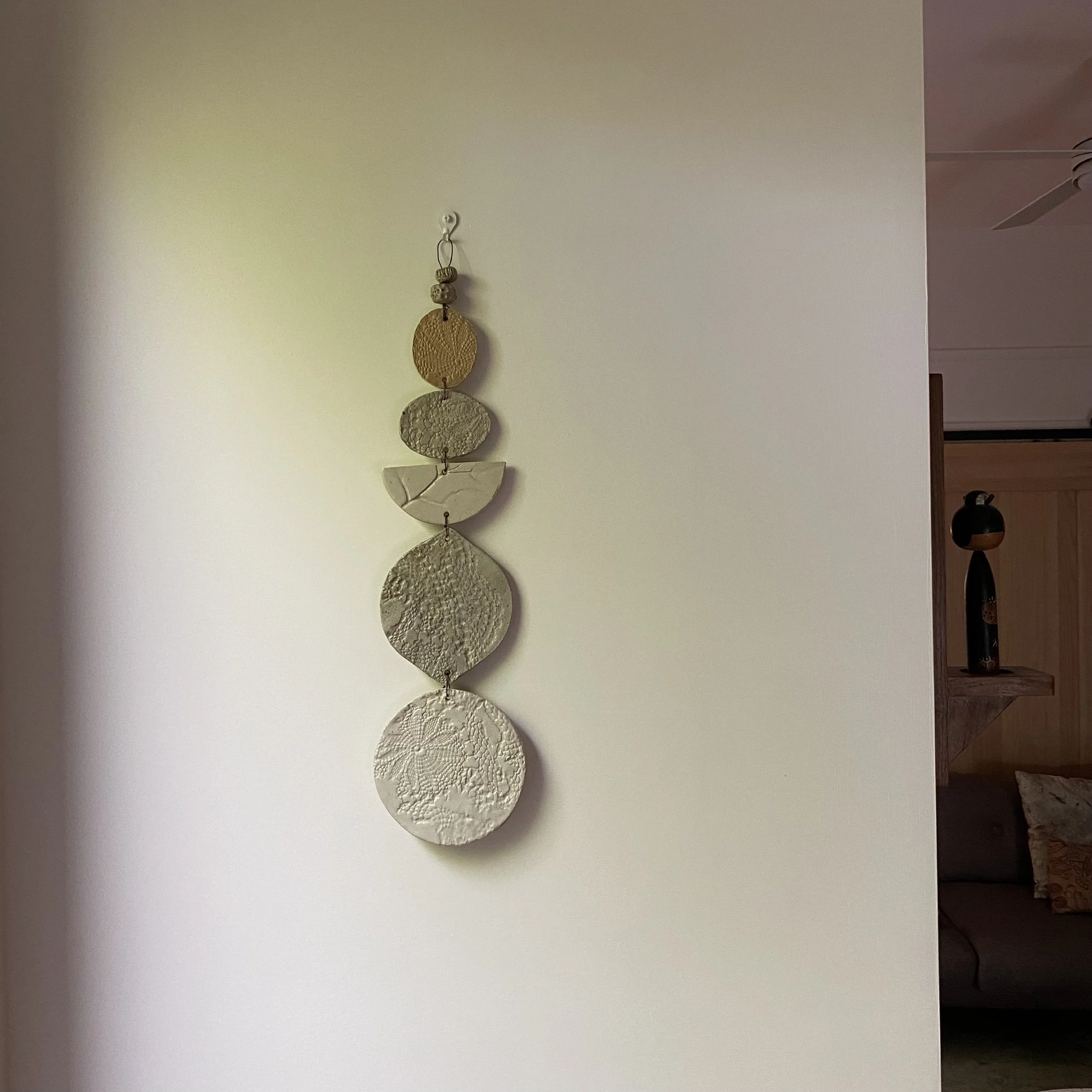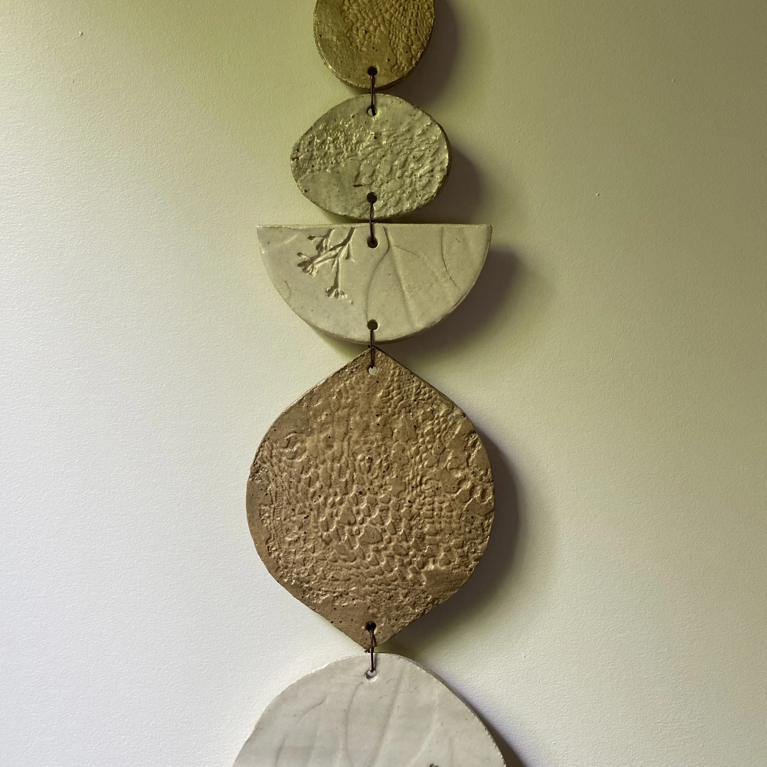 Katrina hand-builds these unique wall hangings in her garden studio. Made with a mixture of grainy clays, they are pressed with local flora and handcrafted heirloom textiles, creating an art piece to be loved. Finished in Ash White.