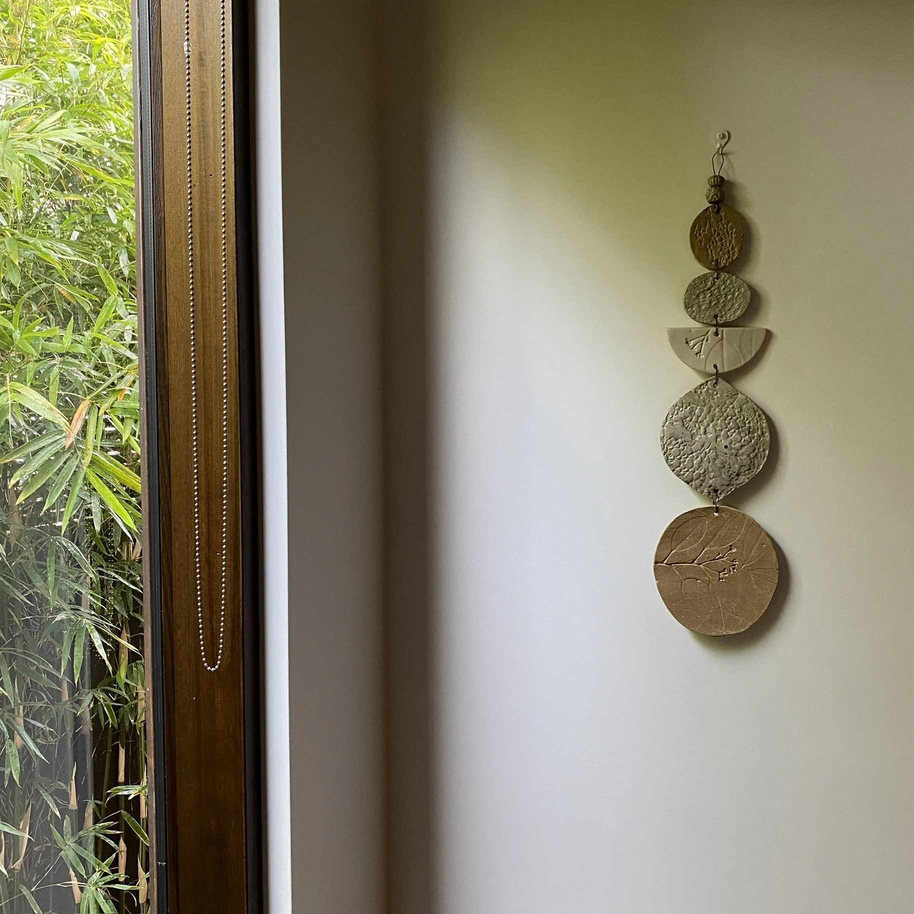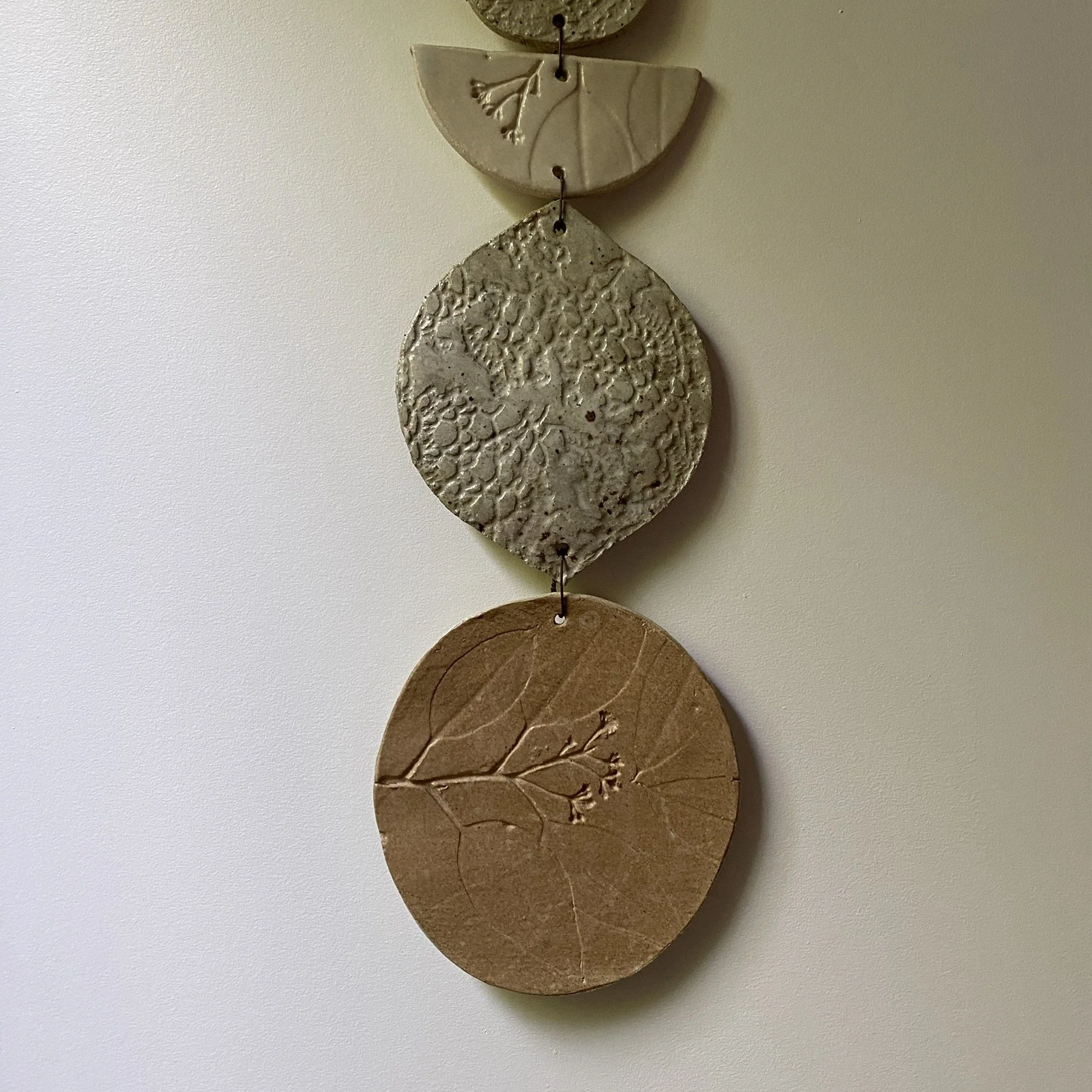 Katrina hand-builds these unique wall hangings in her garden studio. Made with a mixture of grainy clays, they are pressed with local flora and handcrafted heirloom textiles, creating an art piece to be loved.